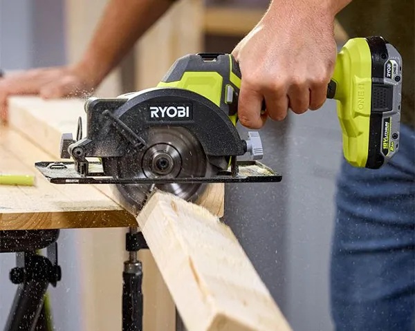 La nueva sierra circular inalámbrica compacta de Ryobi tiene una profundidad de corte máxima de 4.8 cm (1-9/16″), lo que le permite cortar madera de construcción de 2×100 mm en una sola pasada, así como contrachapado, tableros OSB, suelos y otros materiales laminados.