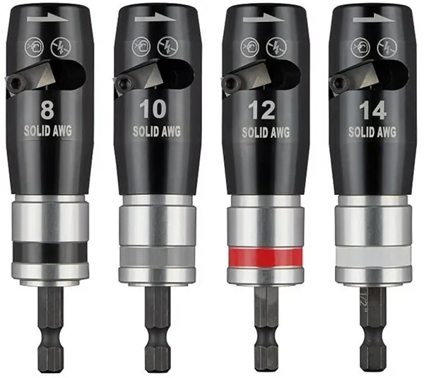 Milwaukee Tool ha lanzado nuevas herramientas pelacables para usar con taladros inalámbricos y atornilladores de impacto. Las nuevas herramientas pelacables se parecen un poco a los destornilladores de tuercas o a los adaptadores de vaso, pero en lugar de colocar tornillos, pelan el aislamiento de los extremos de los cables.