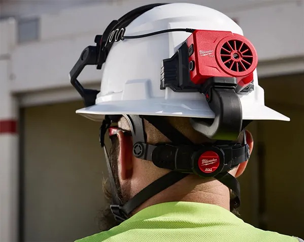 El ventilador para cascos de seguridad de Milwaukee fue diseñado para mayor comodidad de los usuarios durante las sesiones de trabajo, con una velocidad de aire de hasta 24 km/h y hasta 6 horas de autonomía a baja velocidad, alimentado por una batería de 3 Ah.