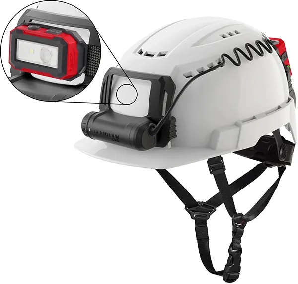 El ventilador también es compatible con las linternas frontales Milwaukee. La batería y el marco de la linterna frontal se montan en la parte delantera del casco, mientras que el ventilador se monta en la parte trasera.