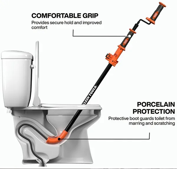 Kleins afirma que el mango de liberación rápida, el almacenamiento con doble cierre y la funda protectora de la barrena mejoran el rendimiento profesional y que su cómodo agarre reduce la fatiga durante las tareas más exigentes de desatasca de inodoros.