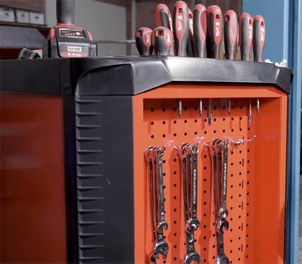 Puedes guardar llaves inglesas de agarre rápido u otras herramientas en el lateral mediante accesorios para el tablero perforado integrado.