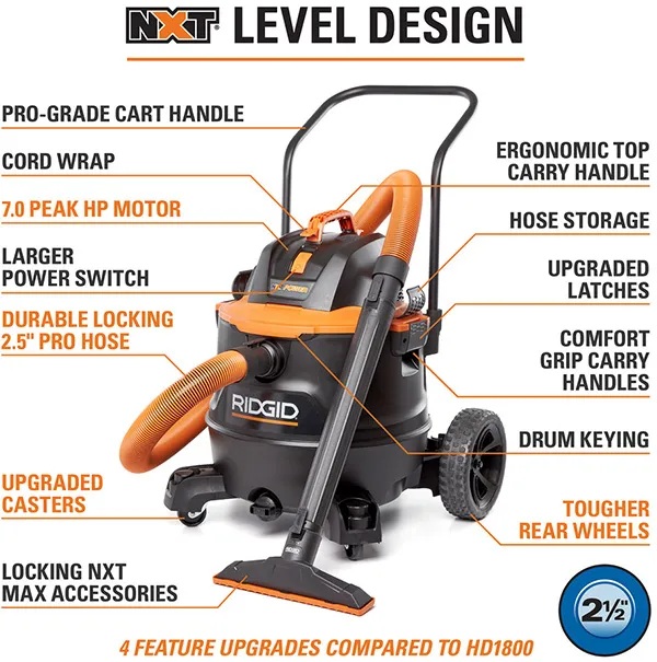 La nueva aspiradora de taller Ridgid NXT Power se anuncia como una aspiradora de taller con un rendimiento inigualable en el mercado, con 7.0 caballos de fuerza máxima, 396 vatios de aire y 202 CFM de potencia de succión.