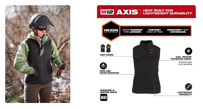 Para quienes prefieren usar capas, el chaleco calefactable AXIS M12 para mujer ofrece protección ligera y gran durabilidad. El tejido de poliéster antidesgarro AXIS resiste los desgarros, mientras que su acabado DWR, resistente al viento y al agua, protege de los elementos.