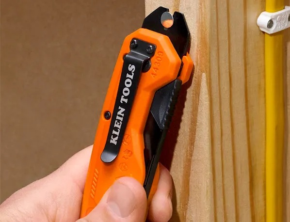 La nueva navaja multiusos Klein se parece mucho a sus otros modelos FlickBlade, con bloqueo de botón, presilla para cordón y dos posiciones de bloqueo para el ángulo de la hoja.