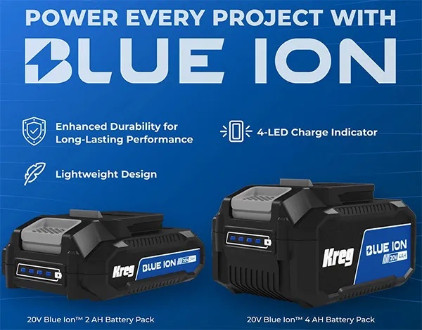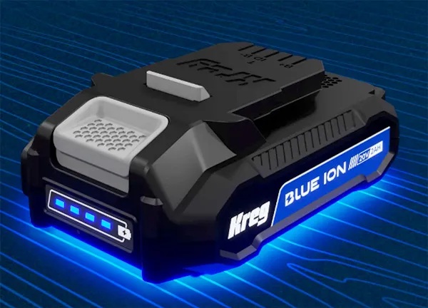 Las nuevas herramientas eléctricas inalámbricas Kreg 20 V Ionic Drive estarán equipadas con sus también nuevas baterías y cargadores Blue Ion de 20 V.