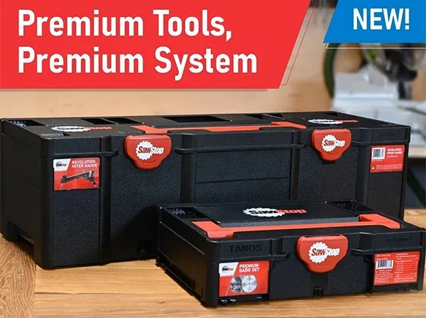 SawStop por sus redes sociales anuncios sobre sus nuevas cajas de herramientas Systainer, promocionando el enfoque de “sistema”. Algunos de los anuncios de SawStop y la página de destino especial declaran “Herramientas Premium, Sistema Premium”.