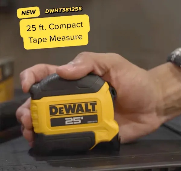 Dewalt anunció recientemente en redes sociales una nueva cinta métrica: un modelo compacto de 7.6 metros, la DWHT38125S. Anuncian que tiene un alcance máximo de 4 metros y un freno de dedo.
